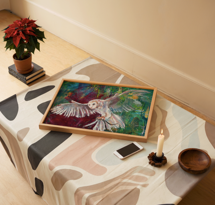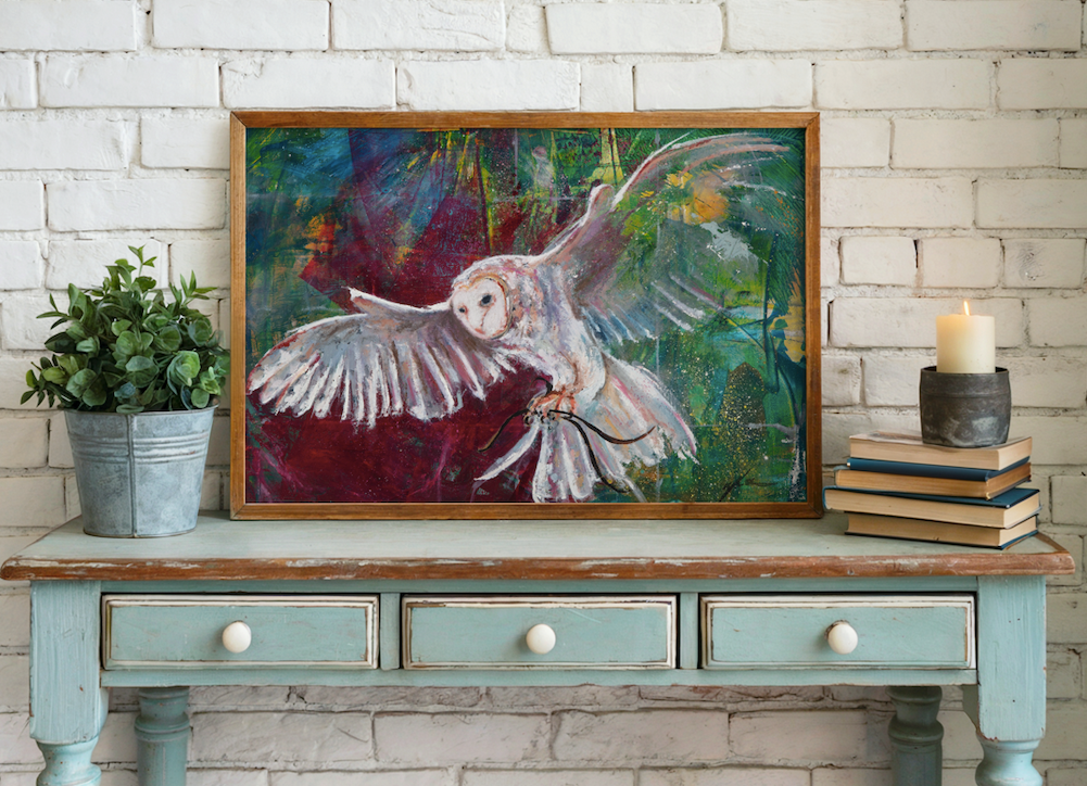 This painting is a perfect blend of realism and abstraction, capturing the essence of the barn owl's mysterious beauty. "Born in the Echoes" would be a striking and contemplative focal point in any room, a piece that invites you to lose yourself in its silent and majestic world.