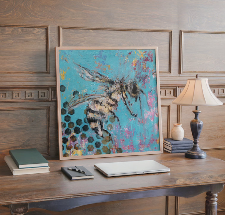 "Restoration" is a powerful and poignant painting that marries the beauty of a honey bee with a profound ecological message. The central figure, a honey bee in dynamic flight, is rendered with expressive strokes of gold, black, and white, its form buzzing with life and motion. This vibrant creature is set against a complex background of layered turquoise and soft pinks, a mix of colors that feels both celestial and earthly.