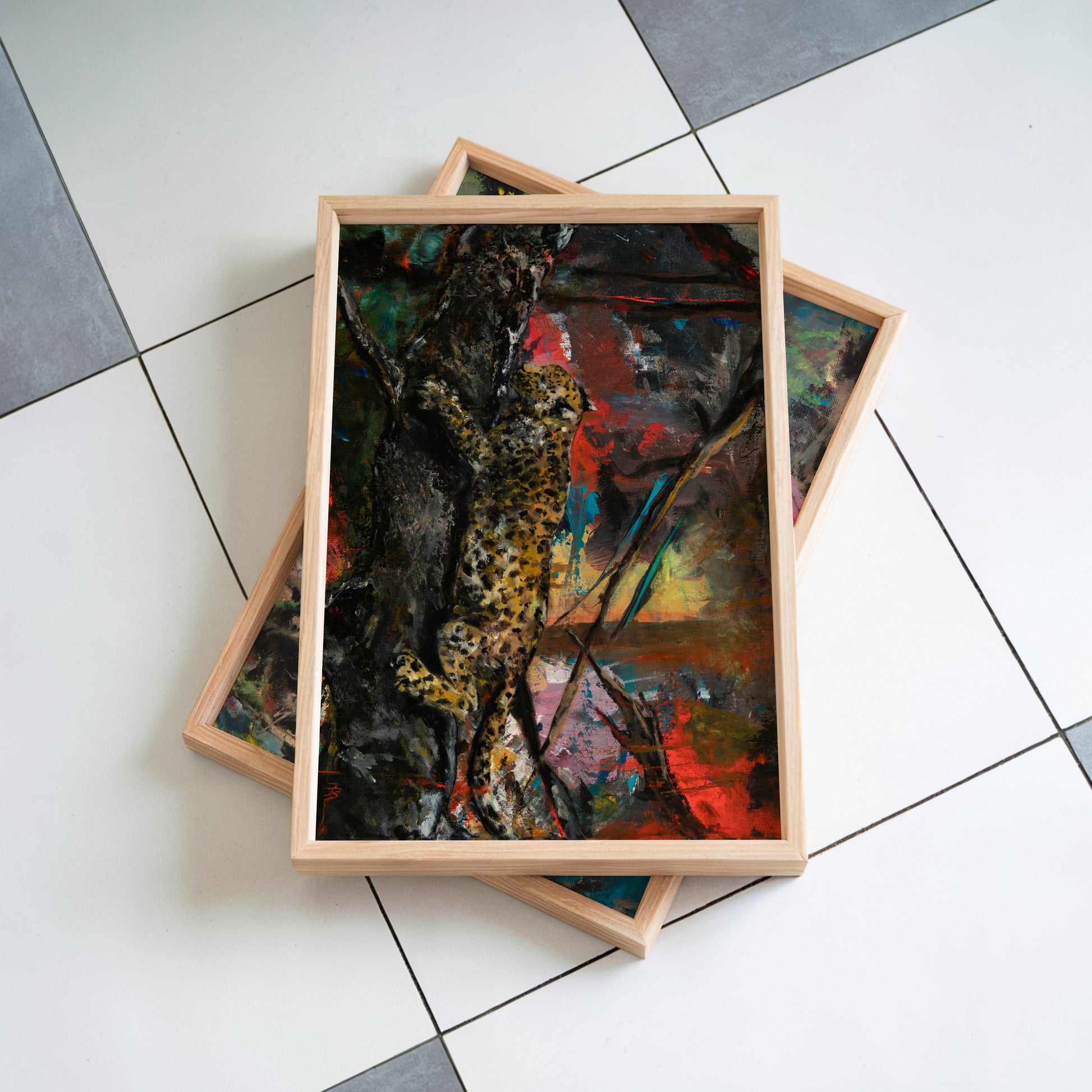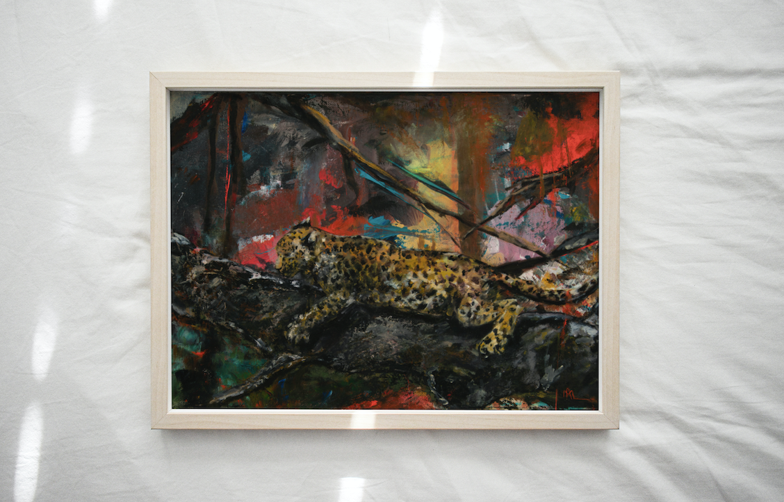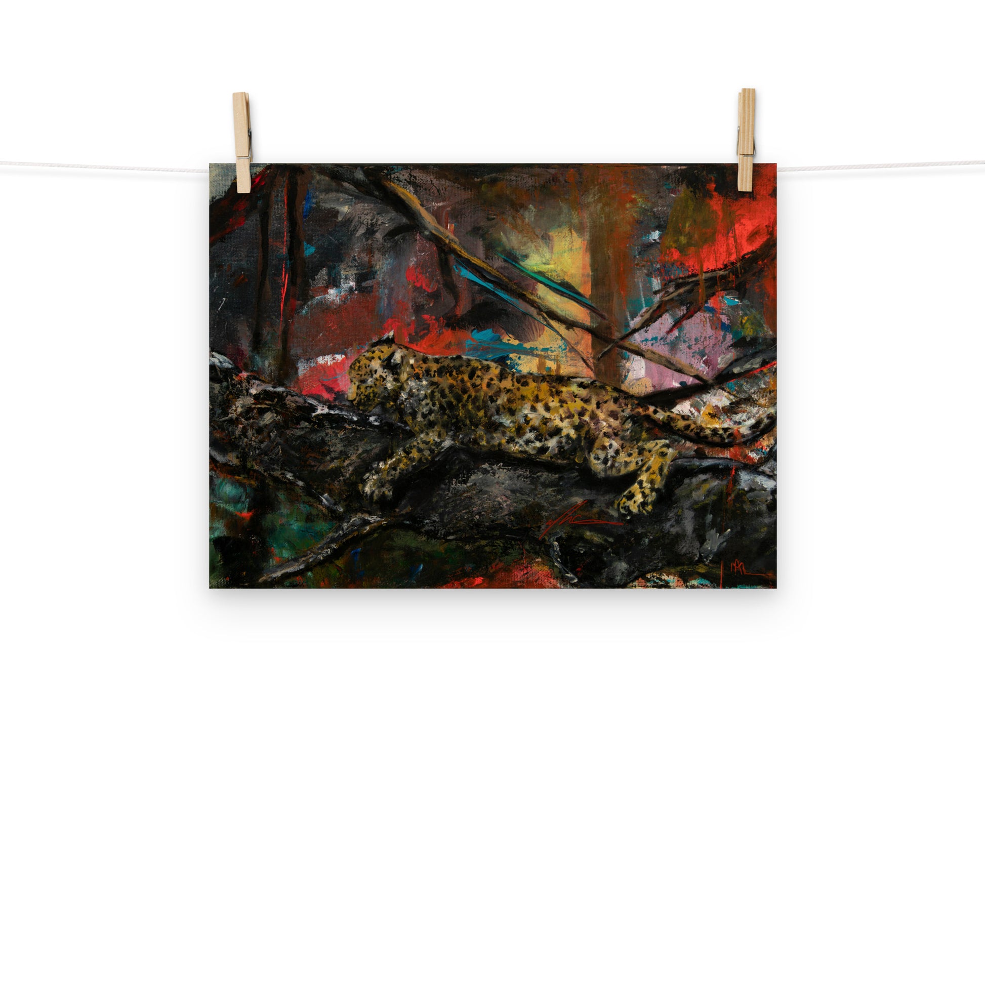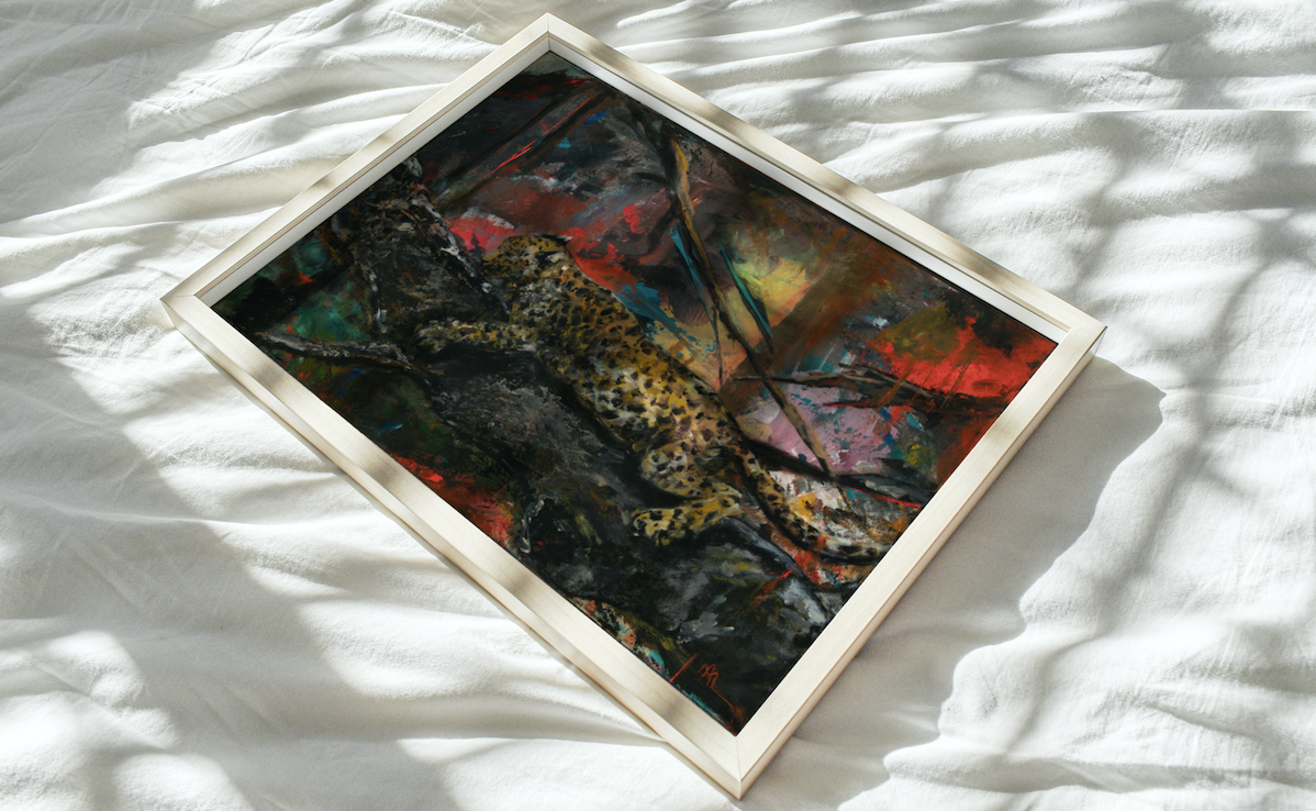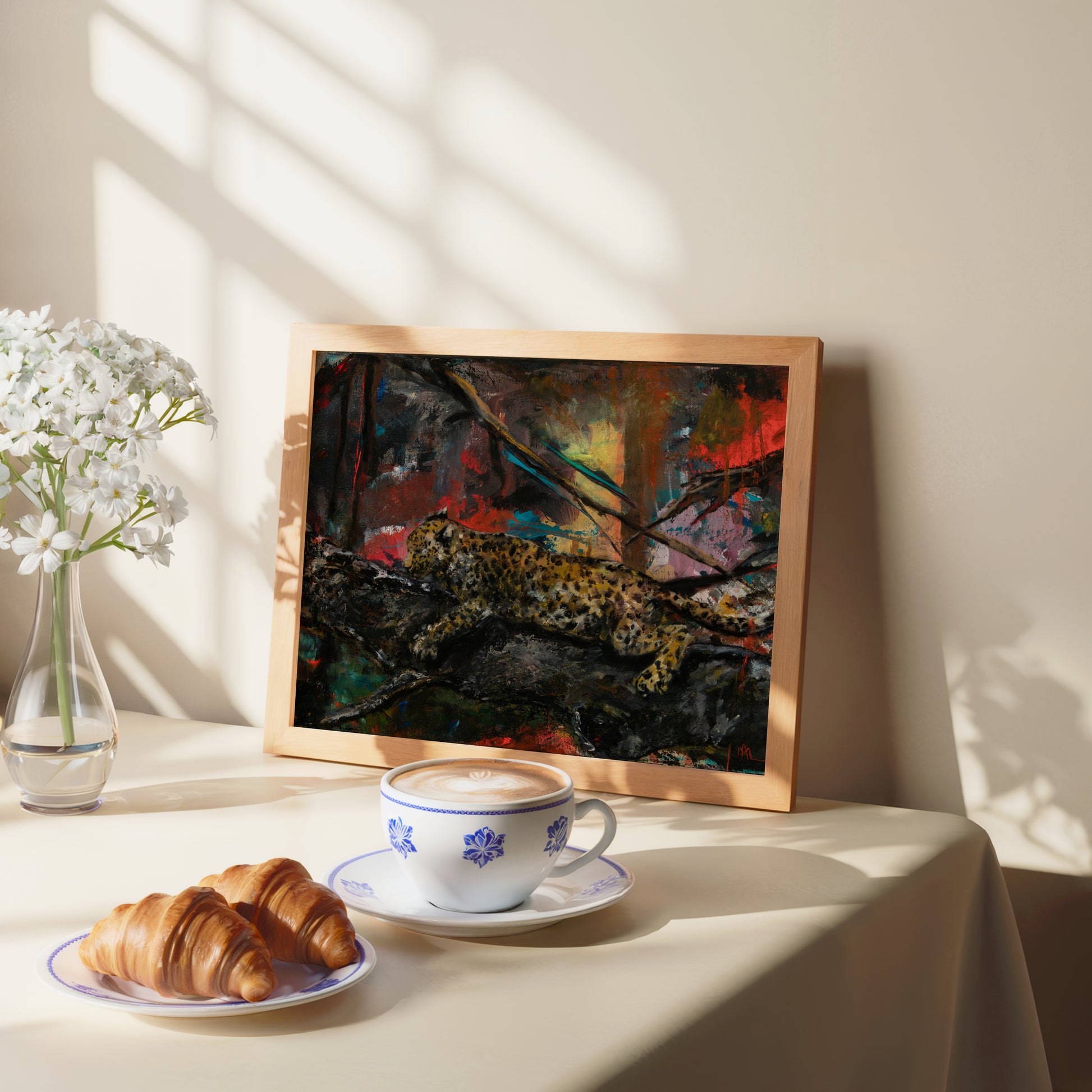 A riot of branches, thick and twisted, where light and shadows melt together, a leopard crouches. Its posture is low and coiled, a symbol of strength and power. A fading habitat. A chaotic undergrowth of tangle and color reflects the shrinking wild, evanescent spaces where these creatures are confined.